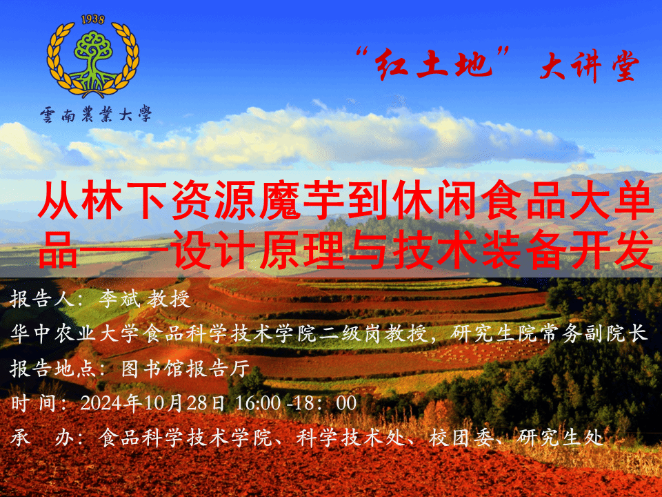 10月28日“红土地”大讲堂:从林下资源魔芋到休闲食品大单品——设计原理与技术装备开发