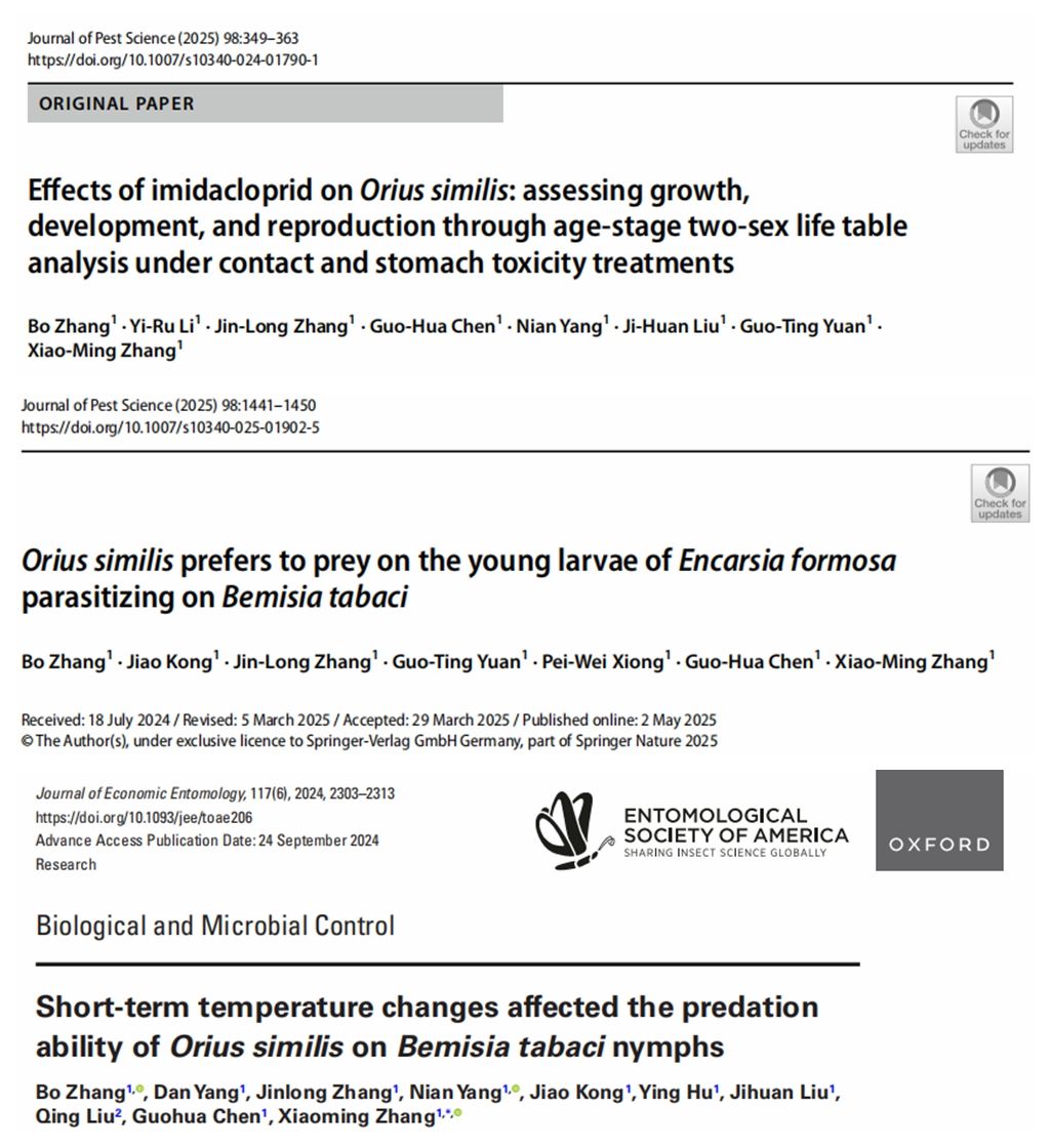 本站消息 近日,威廉希尔植物保护学院张晓明教授团队在昆虫学国际顶刊Entomologia Generalis发表研究论文“Combined release of the predator Orius similis and the parasitoid Encarsia formosa enhances biological control of Bemisia tabaci”(论文链接:https://doi.org/10.1127/entomologia/3837)。2025届硕士研究生张薄为论文第一作者,张晓明教授为通讯作者,张金龙博士等参与研究,陈国华教授给予重要指导。研究表明,捕食性天敌南方小花蝽与寄生性天敌丽蚜小蜂联合释放,可显著提升对烟粉虱的生物防治效果,为农业害虫绿色防控提供了新的研究依据。